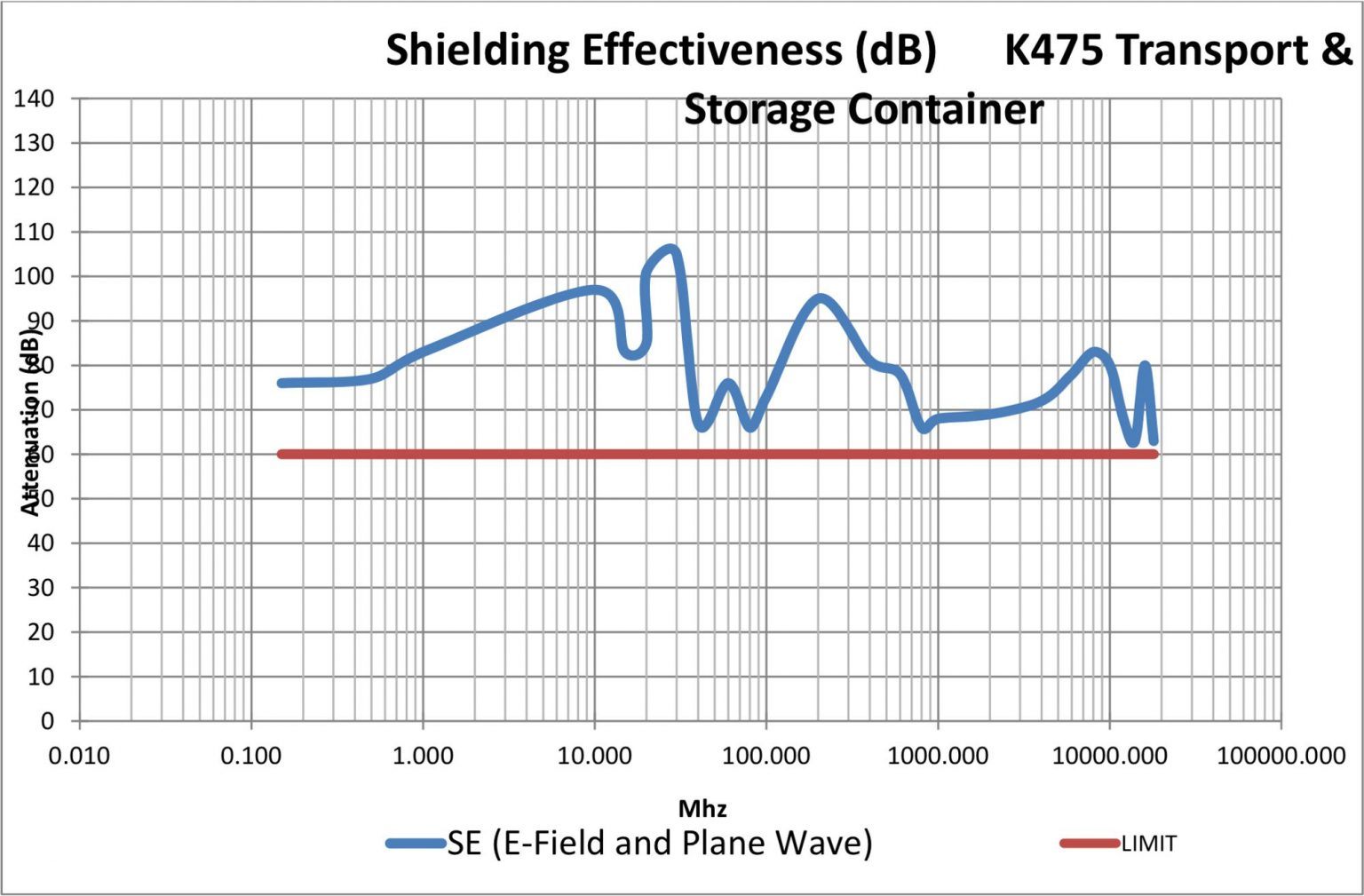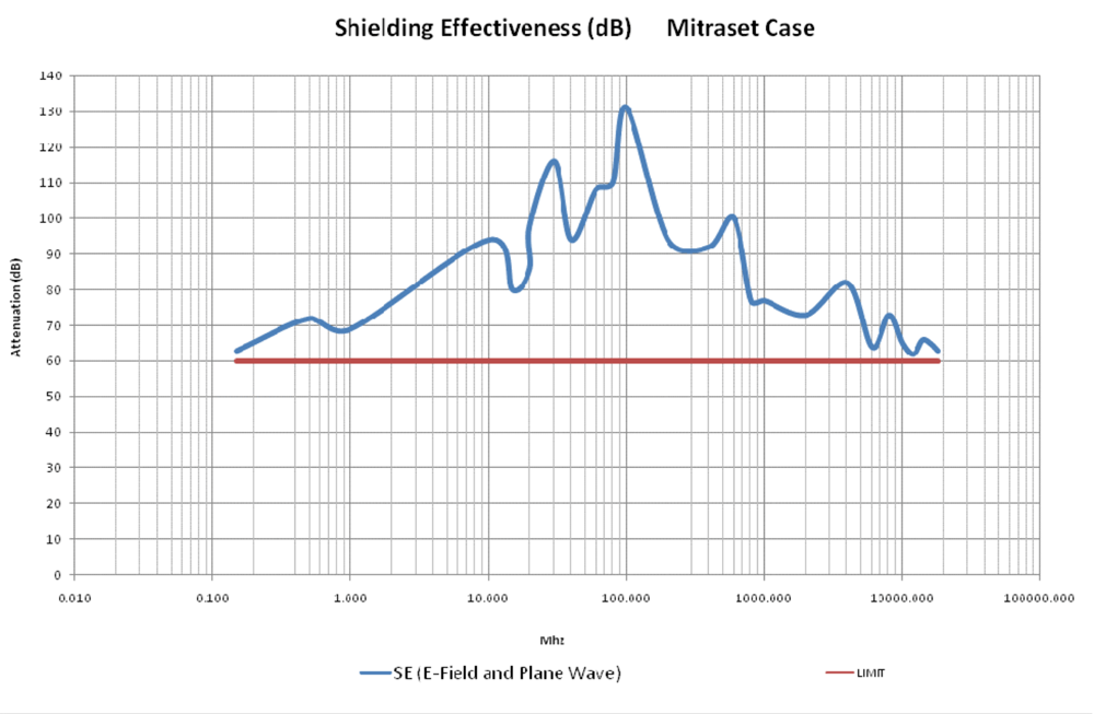 The Mitraset and K475 cases passed the shielding requirements of 60dB from 150kHz to 18GHz.Β The tests were performed at Chomerics, Inc. of Woburn MA. The assessment determined that the Mitraset does comply to the certain requirements set forth in IEEE STD 299.